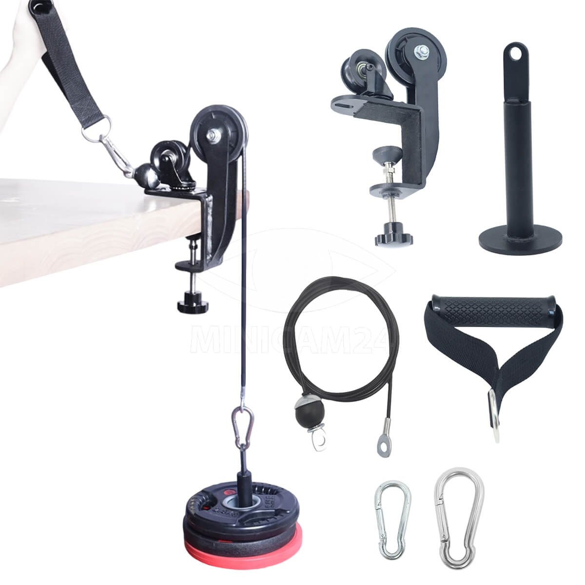 | 1 настольный шкив, 2 пряжки (8 и 6 см),1 кабель длиной 100 см, ручка (15 см), вертикальный гриф (19х8 см) |